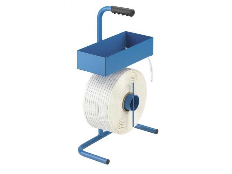Dévidoir portatif en acier avec bac de rangement pour accessoires, boucles et chapes. Adapté aux bobines de feuillard de 25 à 76 mm de diamètre et 150 mm de largeur, avec option frein de déroulement pour un cerclage facile et sûr.